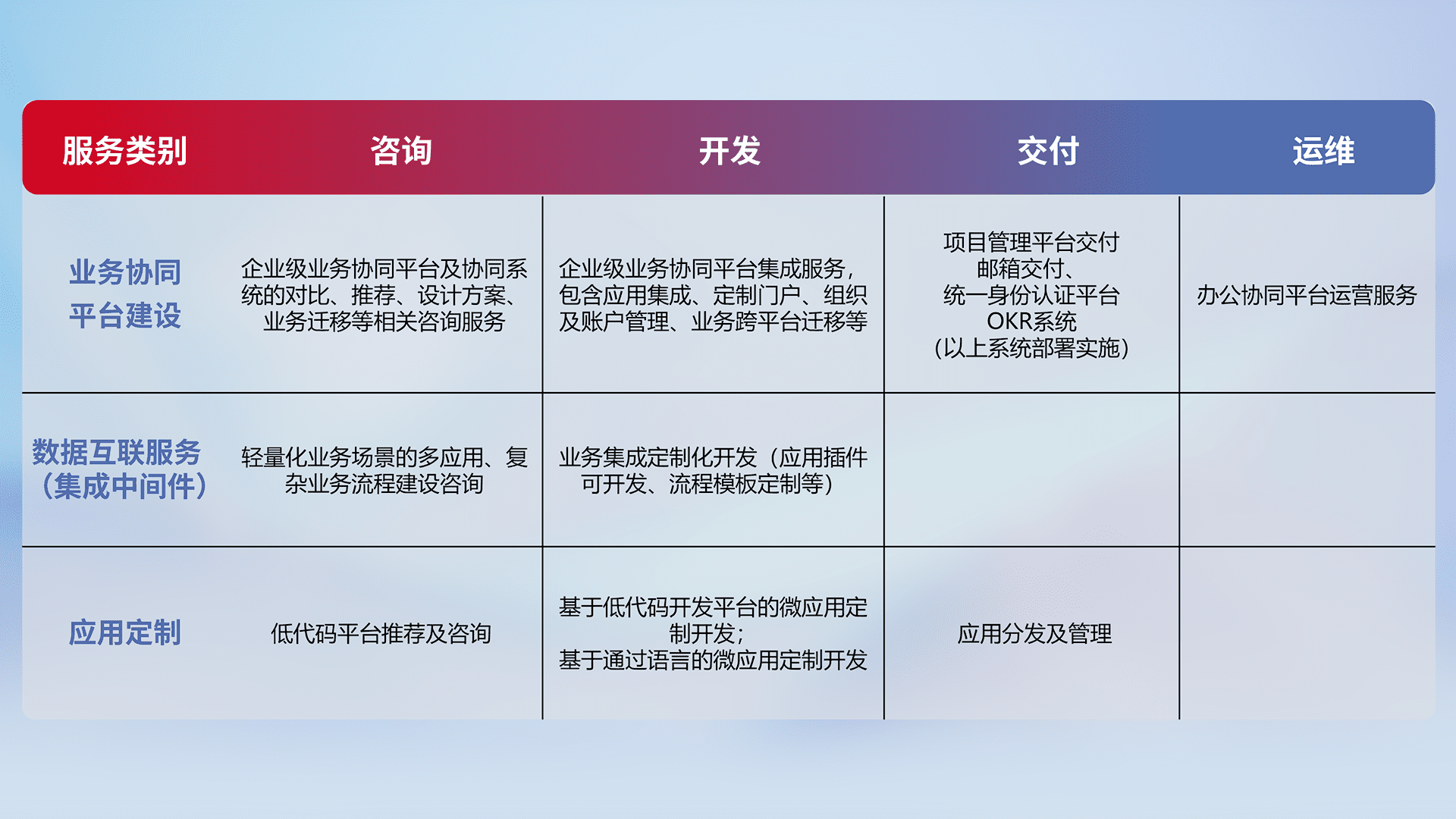 针对钉钉、、、、企微、、IDaas等平台级产品提供产品的规划、、方案、、交付、、定制化开发等服务,,,实现如统一协同办公、、、、智能客户服务、、混合会议管理、、智能数据查询、、等业务场景,,,,实现数字化转型。。。